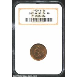 1909-S 1C MS64 Red and Brown NGC. A final-year key from the San Francisco Mint, this is a mostly lustrous survivor whose otherwise orange-gold surfaces yield to delicate patination here and there. The strike is average for the type, and a few scattered flecks of carbon account for the MS64 designation.From the Ronald Bozarth Collection. Important notice: We expect to be auctioning lots at the rate of 200-250 per hour. Sometimes eBay Premier live bid software cannot keep up with that pace, so we strongly recommend that you place a realistic proxy bid now as insurance to avoid disappointment. Also please note that all Heritage/CAA lots purchased through eBay Premier carry a 20% Buyer's Premium. Please make sure you read the Terms and Conditions.