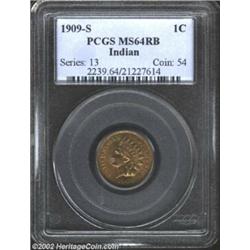 1909-S 1C MS64 Red and Brown PCGS. Only 309,000 pieces were struck of this popular, key issue in the Indian Cent series. This piece has glowing, lustrous surfaces with generous portions of mint red still in evidence. Each side shows the usual overlay of streaky brown patina that is common to Cents of both type that were struck in 1909. Important notice: We expect to be auctioning lots at the rate of 200-250 per hour. Sometimes eBay Premier live bid software cannot keep up with that pace, so we strongly recommend that you place a realistic proxy bid now as insurance to avoid disappointment. Also please note that all Heritage/CAA lots purchased through eBay Premier carry a 20% Buyer's Premium. Please make sure you read the Terms and Conditions.
