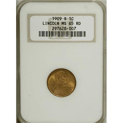 <B>1909-S 1C MS65 Red NGC.</B></I> The sunset-orange surfaces of this first-year San Francisco example display hints of lime color at the margins. Well-defined save for the top of the O in ONE with isolated carbon in the open peripheral regions.<BR><BR><b>Shipping:</b> Coins & Currency (<a target="_blank" href="http://www.heritageauctions.com/common/shipping.php">view shipping information</a>)