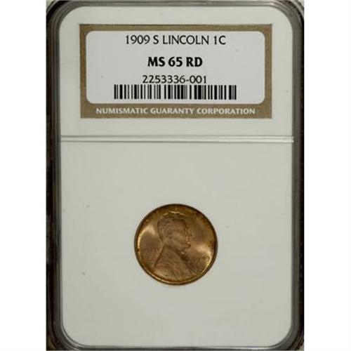 <B>1909-S 1C MS65 Red NGC.</B></I> Lovely peach and mint-green toning on the obverse turns to vivid copper-red and lime-green on the reverse. Both sides of the piece are illuminated by intense, scintillating luster. A well struck and immaculately preserved Gem from the first year of the Lincoln cent series. <BR><BR><B>Coin Engraver:</B> Victor D. Brenner<BR><BR><b>Shipping:</b> Coins & Currency (<a target="_blank" href="http://www.heritageauctions.com/common/shipping.php">view shipping information</a>)