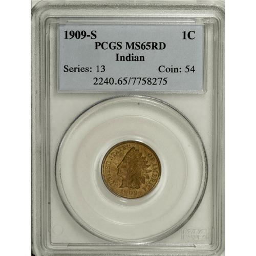 <B>1909-S 1C MS65 Red PCGS.</B></I> Fully brilliant obverse and reverse surfaces have satiny orange luster. This piece is nicely detailed, even though it is not a full strike. The 1909-S Indian cent represents a transitional year that is shared with the first Lincoln cents. This is a particularly attractive Gem specimen.<BR><BR><b>Shipping:</b> Coins & Currency (<a target="_blank" href="http://www.heritageauctions.com/common/shipping.php">view shipping information</a>)