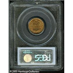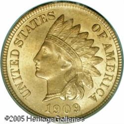 <B>1909-S 1C MS65 Red PCGS.</B></I> Given its status as the final year of issue for the Indian cent, the second year of Small Cent production in San Francisco, and its low mintage of just 309,000 coins which was the lowest mintage of any Indian Cent issue, this has and always will be a popular collectible. It is well struck with only a little weakness at the feather tips. The surfaces are excellent with bright orange mint color and just a slight mellowing to light brown, although not enough to preclude the full Red designation by PCGS. This service has graded only a few finer examples of the issue with brilliant color. Population: 111 in 65, 12 finer (1/05). Lot:5265