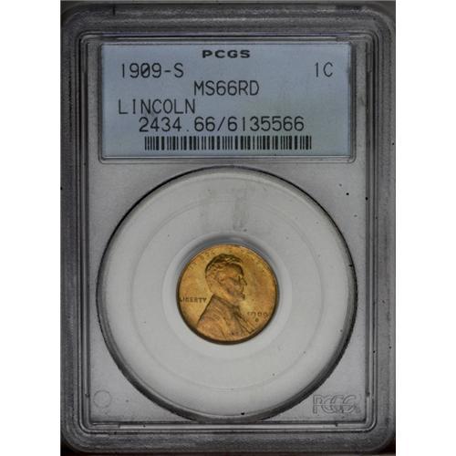 <B>1909-S<1C> MS66 Red PCGS.</B></I> Highly lustrous yellow-gold and pale orange surfaces are typically bold and show remarkable preservation. A small carbon fleck at the bridge of Lincoln's nose is mentioned for pedigree purposes. Finer quality in this popular premier S-mint would be difficult to locate and very pricey. <BR><BR><B>Important notice:</B> Heritage usually auctions material at the rate of 200-250 lots per hour. On some occasions eBay Live bid software or the Internet may not be able to keep up with the pace of the auction. We recommend placing a realistic absentee bid now as insurance to avoid disappointment. Occasionally the auctioneer may eliminate or reject an eBay Live bid, and the auctioneer may also reopen a lot after the close of the eBay live bidding (usually because we missed an audience bid), and may reject your bid even if it shows you as the winning bidder. By bidding via eBay Live, you agree that Heritage may award the lot to another bidder at its sole discretion under the circumstances described above or any other reasonable circumstances. Since eBay bids are not shown to us until we open the lot on the floor, we treat those bids just like floor bids. In most cases the floor responds before the eBay bid is presented to us, due to Internet lag time, so for consistency we have made it a policy that floor bids are always considered first over tie eBay live bids. Also please note that all Heritage lots purchased through eBay Live carry a 20% Buyer's Premium. Please make sure you read the Terms and Conditions before you bid. This lot is being auctioned in conjunction with a live floor auction by Heritage Galleries & Auctioneers. All final auction and invoice information will be supplied by Heritage Galleries & Auctioneers, and all other information should be considered preliminary. Lot:606 <BR><BR><B>Winning Notification and Billing:</B> After the FINAL session in this auction is complete, Heritage will send e-mail and snail mail invoices. This process normally takes several days. All final auction and invoice information will be supplied by Heritage Galleries & Auctioneers, and all other information should be considered preliminary. <BR><BR>This auction will be conducted on a live auction floor and over the Internet through eBay Live. If you choose to place an absentee bid, please take a moment to <font color='#0000ff'><u><a href='http://pages.ebay.com/liveauctions/help/before/laabsentee.html'>learn how eBay Live absentee bidding works</a></u></font><font color='#000000'>