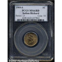 1909-S 1C MS66 Red PCGS. The 1909-S has a paltry mintage of only 309,000 pieces, which rivals the 1877 in desirability and overall rarity. It is also a condition rarity with only eight other MS66 coins certified as such by PCGS and one finer at both of the major services (10/03). This is a lovely, bright orange-red example that has even color over each side, no obvious carbon spots, and no obvious abrasions. Simply stunning quality.From the Richard Collection. Important notice: Heritage usually auctions material at the rate of 200-250 lots per hour. On some occasions eBay Live bid software or the Internet may not be able to keep up with the pace of the auction. We recommend placing a realistic absentee bid now as insurance to avoid disappointment. Occasionally the auctioneer may eliminate or reject an eBay Live bid, and the auctioneer may also reopen a lot after the close of the eBay live bidding (usually because we missed an audience bid), and may reject your bid even if it shows you as the winning bidder. By bidding via eBay Live, you agree that Heritage may award the lot to another bidder at its sole discretion under the circumstances described above or any other reasonable circumstances. Also please note that all Heritage lots purchased through eBay Live carry a 20% Buyer's Premium. Please make sure you read the Terms and Conditions before you bid.