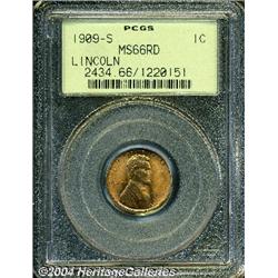 <B>1909-S<1C> MS66 Red PCGS.</B></I> A lustrous Gem with bright orange-gold patina. The strike is very good, and the surfaces are pleasing. A lovely representative from the initial year of the series. <BR><BR><B>Important notice:</B> Heritage usually auctions material at the rate of 200-250 lots per hour. On some occasions eBay Live bid software or the Internet may not be able to keep up with the pace of the auction. We recommend placing a realistic absentee bid now as insurance to avoid disappointment. Occasionally the auctioneer may eliminate or reject an eBay Live bid, and the auctioneer may also reopen a lot after the close of the eBay live bidding (usually because we missed an audience bid), and may reject your bid even if it shows you as the winning bidder. By bidding via eBay Live, you agree that Heritage may award the lot to another bidder at its sole discretion under the circumstances described above or any other reasonable circumstances. Since eBay bids are not shown to us until we open the lot on the floor, we treat those bids just like floor bids. In most cases the floor responds before the eBay bid is presented to us, due to Internet lag time, so for consistency we have made it a policy that floor bids are always considered first over tie eBay live bids. Also please note that all Heritage lots purchased through eBay Live carry a 20% Buyer's Premium. Please make sure you read the Terms and Conditions before you bid.
