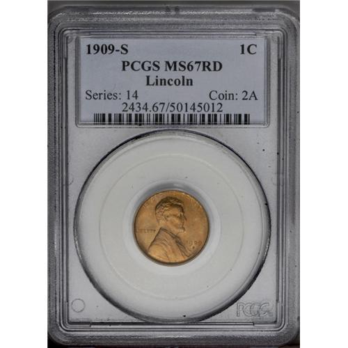 <B>1909-S<1C> MS67 Red PCGS.</B></I> Bright reddish-golden hues dominate the surfaces of this incredible first-year Lincoln, each side being aglow with rich, satiny luster. Close examination yields a few well scattered, microscopic carbon flecks and a short paper-thin blemish above the Y in LIBERTY, the only appreciable difference between the coin now and when it left the dies. Only the most devoted specialist in the popular series of Lincoln cents knows that even its widely known counterpart with designer's initials on the reverse is not as elusive as the 1909-S Lincoln in Superb Red condition. Population: 4 in 67, 0 finer (3/06). <BR><BR><B>Important notice:</B> Heritage usually auctions material at the rate of 200-250 lots per hour. On some occasions eBay Live bid software or the Internet may not be able to keep up with the pace of the auction. We recommend placing a realistic absentee bid now as insurance to avoid disappointment. Occasionally the auctioneer may eliminate or reject an eBay Live bid, and the auctioneer may also reopen a lot after the close of the eBay live bidding (usually because we missed an audience bid), and may reject your bid even if it shows you as the winning bidder. By bidding via eBay Live, you agree that Heritage may award the lot to another bidder at its sole discretion under the circumstances described above or any other reasonable circumstances. Since eBay bids are not shown to us until we open the lot on the floor, we treat those bids just like floor bids. In most cases the floor responds before the eBay bid is presented to us, due to Internet lag time, so for consistency we have made it a policy that floor bids are always considered first over tie eBay live bids. Also please note that all Heritage lots purchased through eBay Live carry a 20% Buyer's Premium. Please make sure you read the Terms and Conditions before you bid. This lot is being auctioned in conjunction with a live floor auction by Heritage Galleries & Auctioneers. All final auction and invoice information will be supplied by Heritage Galleries & Auctioneers, and all other information should be considered preliminary. Lot:607 <BR><BR><B>Winning Notification and Billing:</B> After the FINAL session in this auction is complete, Heritage will send e-mail and snail mail invoices. This process normally takes several days. All final auction and invoice information will be supplied by Heritage Galleries & Auctioneers, and all other information should be considered preliminary. <BR><BR>This auction will be conducted on a live auction floor and over the Internet through eBay Live. If you choose to place an absentee bid, please take a moment to <font color='#0000ff'><u><a href='http://pages.ebay.com/liveauctions/help/before/laabsentee.html'>learn how eBay Live absentee bidding works</a></u></font><font color='#000000'>