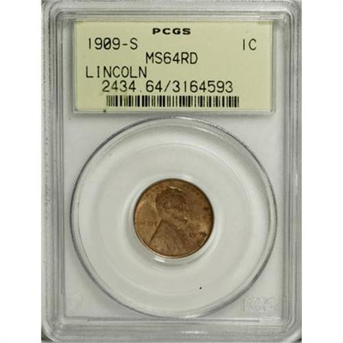<B>1909-S 1C MS64 Red PCGS.</B></I> PCGS Population (415/513). NGC Census: (138/224). Mintage: 1,825,000. Numismedia Wsl. Price for NGC/PCGS coin in MS64: $500. (#2434)<BR><BR><B>Coin Engraver:</B> Victor D. Brenner<BR><BR><b>Shipping:</b> Coins & Currency (<a target="_blank" href="http://www.heritageauctions.com/common/shipping.php">view shipping information</a>)