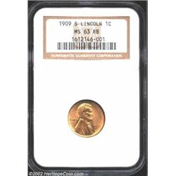 1909-S 1C S Over Horizontal S MS63 Red and Brown NGC. Although not designated as such on the insert, this Cent appears to be a later die state of FS-12.3, the Guide Book inverted mintmark variety. The obverse is flashy and has splendid olive-yellow color, while the reverse has dusky olive and lilac swirls. Sharply struck and impressively preserved. Important notice: We expect to be auctioning lots at the rate of 200-250 per hour. Sometimes eBay Premier live bid software cannot keep up with that pace, so we strongly recommend that you place a realistic proxy bid now as insurance to avoid disappointment. Also please note that all Heritage/CAA lots purchased through eBay Premier carry a 20% Buyer's Premium. Please make sure you read the Terms and Conditions.