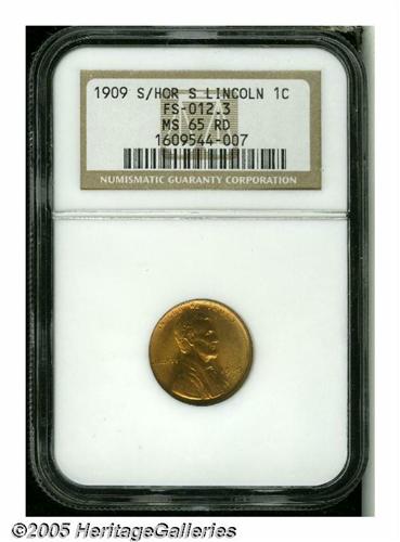 <B>1909-S<1C> S Over Horizontal S MS65 Red NGC.</B></I> FS-012.3. Beautiful straw-gold and rose hues endow this lustrous and meticulously struck low mintage Lincoln Cent. Only a couple of pinpoint carbon flecks on the central obverse deny perfection.
