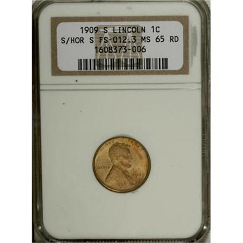 <B>1909-S 1C S Over Horizontal S MS65 Red NGC.</B></I> FS-012.3. A lustrous copper-gold example with splashes of orange, along with an impressive strike that imparts strong definition to the design elements. A scattering of inoffensive light flecks is noted for each side. Census: 45 in 65 Red, 24 finer (1/08).<BR><BR><b>Shipping:</b> Coins & Currency (<a target="_blank" href="http://www.heritageauctions.com/common/shipping.php">view shipping information</a>)