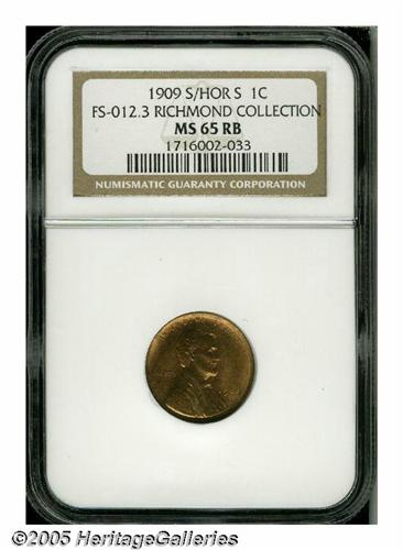 <B>1909-S<1C> S Over Horizontal S MS65 Red and Brown NGC.</B></I> Ex: Richmond Collection. FS-012.3. A lovely and well struck honey-gold Gem. Essentially perfect aside from a toning fleck above the A in STATES and a tick on the forehead. An interesting example, the rims are unusually wide and rounded.