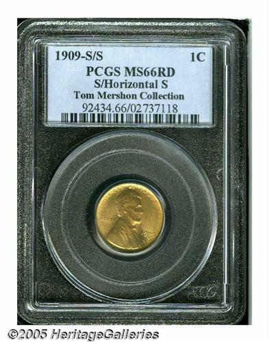 <B>1909-S<1C> S Over Horizontal S MS66 Red PCGS.</B></I> FS-012.3. This popular variant of the very scarce 1909-S shows a sideways S beneath the dominant S mintmark. Sharply struck throughout, the lustrous surfaces show rich copper-golden coloration with a faint accent of crimson over the highpoints of the obverse portrait. Seldom seen in such a superior state. Population: 31 in 66, 0 finer (3/05).<BR><I>From The Tom Mershon #2 All-Time PCGS Registry Set of Lincoln Wheat Cents.</B></I>