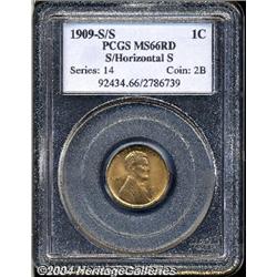 <B>1909-S<1C> S Over Horizontal S MS66 Red PCGS.</B></I> When the mintmark was punched in this die, the workman got it wrong, first entering the small S sideways, then going back to correct his work. This blundered die was then placed in use, where an unspecified number of coins were produced. At least seven obverse dies were used for the coinage of 1909-S cents, suggesting that one-seventh the original mintage was this variety, amounting to about 260,000 coins. That would imply that this variety is even scarcer than the important 1909-S VDB cent. This example is fully brilliant with frosty orange luster and excellent surfaces. It is tied for the finest of the variety certified by PCGS. Add this one to your Set Registry collection. <BR><BR><B>Important notice:</B> Heritage usually auctions material at the rate of 200-250 lots per hour. On some occasions eBay Live bid software or the Internet may not be able to keep up with the pace of the auction. We recommend placing a realistic absentee bid now as insurance to avoid disappointment. Occasionally the auctioneer may eliminate or reject an eBay Live bid, and the auctioneer may also reopen a lot after the close of the eBay live bidding (usually because we missed an audience bid), and may reject your bid even if it shows you as the winning bidder. By bidding via eBay Live, you agree that Heritage may award the lot to another bidder at its sole discretion under the circumstances described above or any other reasonable circumstances. Since eBay bids are not shown to us until we open the lot on the floor, we treat those bids just like floor bids. In most cases the floor responds before the eBay bid is presented to us, due to Internet lag time, so for consistency we have made it a policy that floor bids are always considered first over tie eBay live bids. Also please note that all Heritage lots purchased through eBay Live carry a 20% Buyer's Premium. Please make sure you read the Terms and Conditions before you bid.
