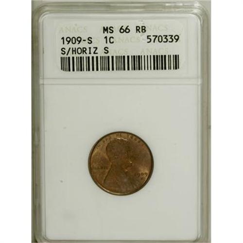 <B>1909-S 1C S Over Horizontal S MS66 Red and Brown ANACS.</B></I> FS-012.3. This curious mintmark variant actually constitutes a large percentage of high quality 1909-S Lincoln cents. The impeccably smooth surfaces have mellowed to a relatively uniform amber-brown. Close inspection locates unimportant peripheral carbon.<BR><BR><b>Shipping:</b> Coin/Currency (<a target="_blank" href="http://www.heritageauctions.com/common/shipping.php">view shipping information</a>)