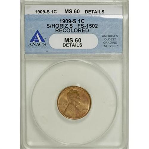 <B>1909-S 1C S Over Horizontal S--Recolored--ANACS. MS60 Details.</B></I> FS-1502. NGC Census: (0/122). PCGS Population (0/315). (#92434)<BR><BR><b>Shipping:</b> Coins & Currency (<a target="_blank" href="http://www.heritageauctions.com/common/shipping.php">view shipping information</a>)