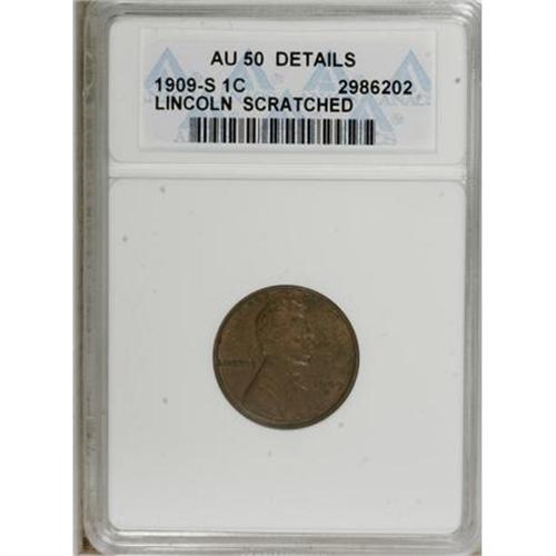 <B>1909-S 1C --Scratched--ANACS. AU50 Details.</B></I> NGC Census: (12/183). PCGS Population (28/192). Mintage: 1,825,000. Numismedia Wsl. Price for NGC/PCGS coin in AU50: $180. (#2432)<BR><BR><b>Shipping:</b> Coins & Currency (<a target="_blank" href="http://www.heritageauctions.com/common/shipping.php">view shipping information</a>)