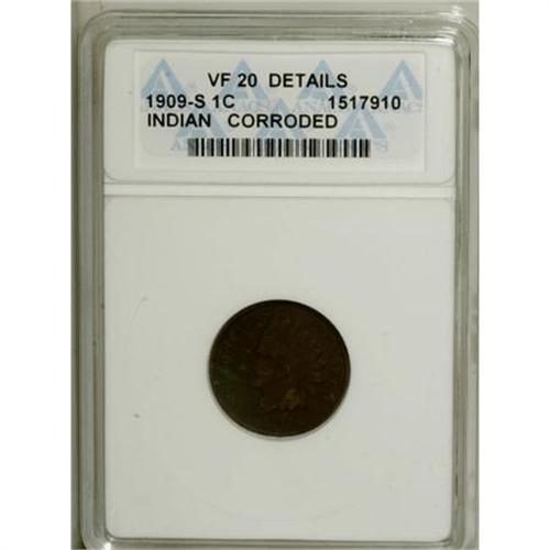 <B>1909-S 1C --Corroded--ANACS. VF20 Details.</B></I> NGC Census: (49/597). PCGS Population (114/975). Mintage: 309,000. Numismedia Wsl. Price for NGC/PCGS coin in VF20: $442. (#2238)<BR><BR><B>Coin Engraver:</B> James B. Longacre<BR><BR><b>Shipping:</b> Coins & Currency (<a target="_blank" href="http://www.heritageauctions.com/common/shipping.php">view shipping information</a>)