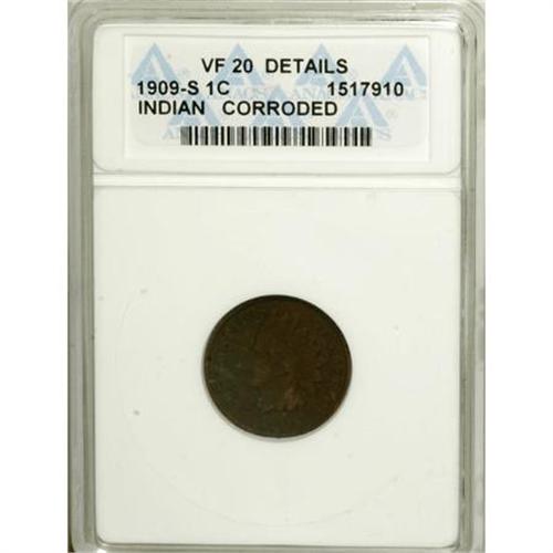 <B>1909-S 1C --Corroded--ANACS. VF20 Details.</B></I> NGC Census: (49/597). PCGS Population (114/975). Mintage: 309,000. Numismedia Wsl. Price for NGC/PCGS coin in VF20: $442. (#2238)<BR><BR><B>Coin Engraver:</B> James B. Longacre<BR><BR><b>Shipping:</b> Coins & Currency (<a target="_blank" href="http://www.heritageauctions.com/common/shipping.php">view shipping information</a>)