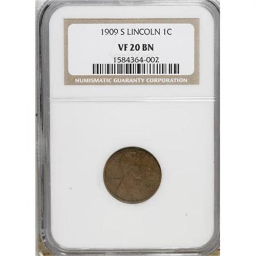 <B>1909-S 1C VF20 NGC.</B></I> NGC Census: (0/0). PCGS Population (0/0). Mintage: 1,825,000. (#2432)<BR><BR><B>Coin Engraver:</B> Victor D. Brenner<BR><BR><b>Shipping:</b> Coins & Currency (<a target="_blank" href="http://www.heritageauctions.com/common/shipping.php">view shipping information</a>)