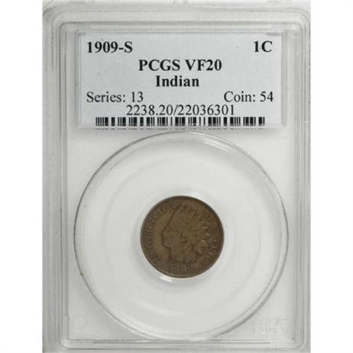 <B>1909-S 1C VF20 PCGS.</B></I> . PCGS Population (123/1058). NGC Census: (52/649). Mintage: 309,000. Numismedia Wsl. Price for NGC/PCGS coin in VF20: $480. (#2238)<BR><BR><B>Coin Engraver:</B> James B. Longacre<BR><BR><b>Shipping:</b> Coins & Currency (<a target="_blank" href="http://www.heritageauctions.com/common/shipping.php">view shipping information</a>)