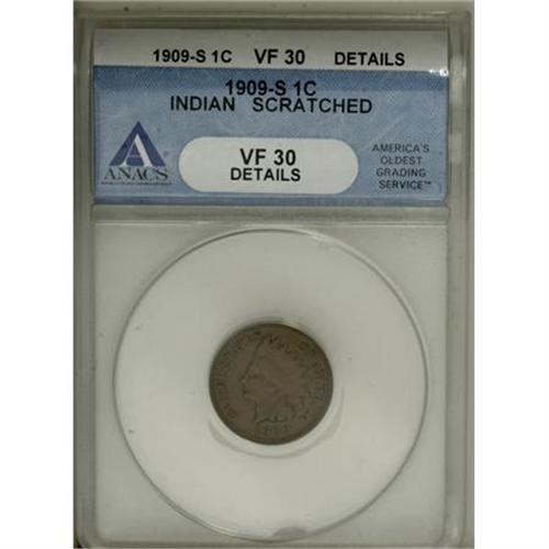 <B>1909-S 1C --Scratched--ANACS. VF30 Details.</B></I> NGC Census: (78/518). PCGS Population (140/759). Mintage: 309,000. Numismedia Wsl. Price for NGC/PCGS coin in VF30: $508. (#2238)<BR><BR><B>Coin Engraver:</B> James B. Longacre<BR><BR><b>Shipping:</b> Coins & Currency (<a target="_blank" href="http://www.heritageauctions.com/common/shipping.php">view shipping information</a>)