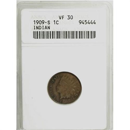 <B>1909-S 1C VF30 ANACS.</B></I> . NGC Census: (78/523). PCGS Population (145/772). Mintage: 309,000. Numismedia Wsl. Price for NGC/PCGS coin in VF30: $516. (#2238)<BR><BR><B>Coin Engraver:</B> James B. Longacre<BR><BR><b>Shipping:</b> Coins & Currency (<a target="_blank" href="http://www.heritageauctions.com/common/shipping.php">view shipping information</a>)