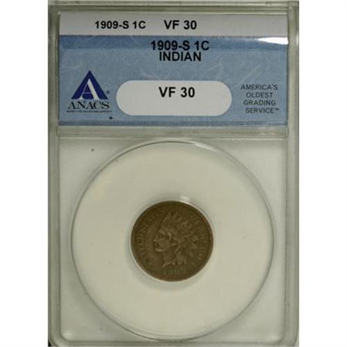 <B>1909-S 1C VF30 ANACS.</B></I> . NGC Census: (78/524). PCGS Population (146/780). Mintage: 309,000. Numismedia Wsl. Price for NGC/PCGS coin in VF30: $516. (#2238)<BR><BR><B>Coin Engraver:</B> James B. Longacre<BR><BR><b>Shipping:</b> Coins & Currency (<a target="_blank" href="http://www.heritageauctions.com/common/shipping.php">view shipping information</a>)