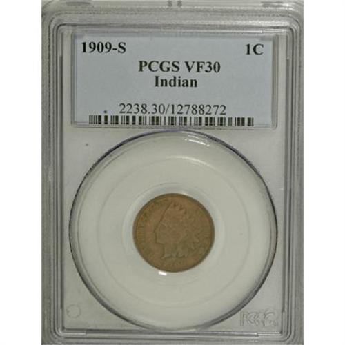 <B>1909-S 1C VF30 PCGS.</B></I> This pleasing, moderately circulated example would be ideal for a similarly graded date set. A light woodgrain pattern on the obverse shifts from oak to mahogany. Neither side shows any overt abrasions.<BR><BR><B>Coin Engraver:</B> James B. Longacre<BR><BR><b>Shipping:</b> Coins & Currency (<a target="_blank" href="http://www.heritageauctions.com/common/shipping.php">view shipping information</a>)