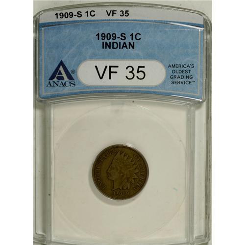 <B>1909-S 1C VF35 ANACS.</B></I> NGC Census: (195/416). PCGS Population (131/0). Mintage: 309,000. Numismedia Wsl. Price for NGC/PCGS coin in VF35: $454. (#2238)<BR><BR><b>Shipping:</b> Coins & Currency (<a target="_blank" href="http://www.heritageauctions.com/common/shipping.php">view shipping information</a>)
