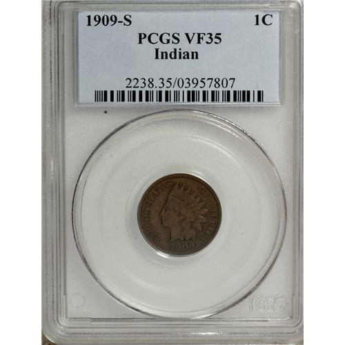 <B>1909-S 1C VF35 PCGS.</B></I> PCGS Population (127/546). NGC Census: (194/416). Mintage: 309,000. Numismedia Wsl. Price: $454. (#2238)<BR><BR><b>Shipping:</b> Coins & Currency (<a target="_blank" href="http://www.heritageauctions.com/common/shipping.php">view shipping information</a>)