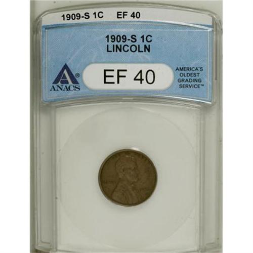 <B>1909-S 1C XF40 ANACS.</B></I> NGC Census: (37/234). PCGS Population (74/315). Mintage: 1,825,000. Numismedia Wsl. Price for NGC/PCGS coin in XF40: $165. (#2432)<BR><BR><B>Coin Engraver:</B> Victor D. Brenner<BR><BR><b>Shipping:</b> Coins & Currency (<a target="_blank" href="http://www.heritageauctions.com/common/shipping.php">view shipping information</a>)