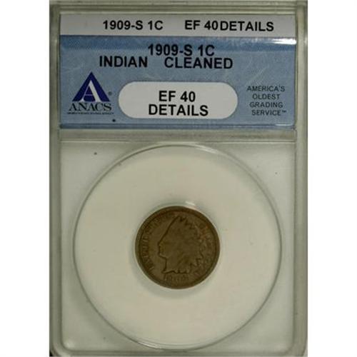 <B>1909-S 1C --Cleaned--ANACS XF40 Details.</B></I> NGC Census: (66/412). PCGS Population (147/484). Mintage: 309,000. Numismedia Wsl. Price for NGC/PCGS coin in XF40: $570. (#2238)<BR><BR><B>Coin Engraver:</B> James B. Longacre<BR><BR><b>Shipping:</b> Coins & Currency (<a target="_blank" href="http://www.heritageauctions.com/common/shipping.php">view shipping information</a>)