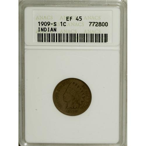 <B>1909-S 1C XF45 ANACS.</B></I> NGC Census: (76/289). PCGS Population (105/323). Mintage: 309,000. Numismedia Wsl. Price: $493. (#2238)<BR><BR><b>Shipping:</b> Coins & Currency (<a target="_blank" href="http://www.heritageauctions.com/common/shipping.php">view shipping information</a>)