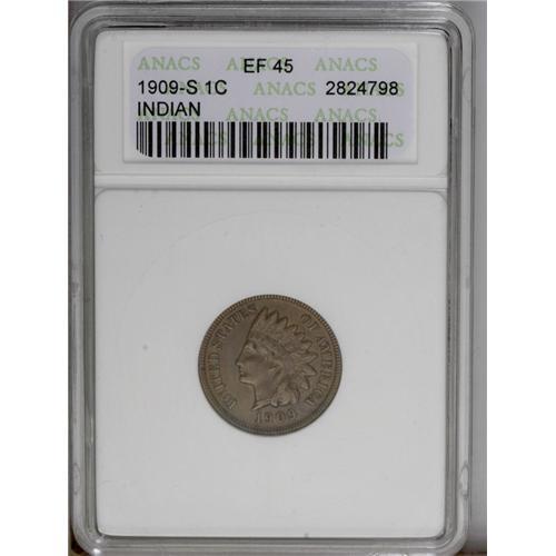 <B>1909-S<1C> XF45 ANACS.</B></I> Softly struck on the headdress and lightly worn on Liberty's hair details, with crisply defined and essentially full design details on the reverse. A couple of faint carbon specks and a few wispy field marks are noted on the obverse. Overall, a very nice XF example of this important key date.