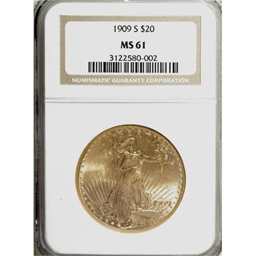 <B>1909-S $20 MS61 NGC.</B></I> NGC Census: (355/4144). PCGS Population (444/4378). Mintage: 2,774,925. Numismedia Wsl. Price for NGC/PCGS coin in MS61: $885. (#9153)<BR><BR><B>Coin Engraver:</B> Augustus Saint-Gaudens<BR><BR><b>Shipping:</b> Coins & Currency (<a target="_blank" href="http://www.heritageauctions.com/common/shipping.php">view shipping information</a>)