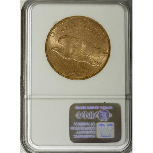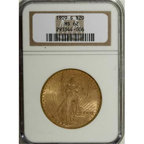 <B>1909-S $20 MS62 NGC.</B></I> NGC Census: (1097/2972). PCGS Population (1157/3012). Mintage: 2,774,925. Numismedia Wsl. Price for NGC/PCGS coin in MS62: $725. (#9153)<BR><BR><B>Coin Engraver:</B> Augustus Saint-Gaudens<BR><BR><b>Shipping:</b> Coins & Currency (<a target="_blank" href="http://www.heritageauctions.com/common/shipping.php">view shipping information</a>)
