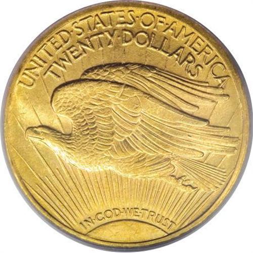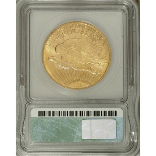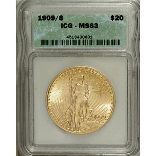 <B>1909/8 $20 MS63 ICG.</B></I> The 1909/8 Saint-Gaudens twenty is celebrated as the only overdate in the series. In the early years of the Mint, devices (stars, letters and numbers) were individually punched into each working die. In 1909, and for many years prior, the date was an integral part of the hub. A die sinker, for whatever reason, used both 1908 No Motto and 1909 obverse hubs to prepare a working die, which required multiple impressions to complete. While not a traditional overdate (a previously used working die that is modified for use in a subsequent year), the 1909/8 adds some spice to this popular series. This honey-gold specimen is lustrous and completely worthy of the assigned grade. The only distraction that requires mention is a nick on the eagle's left wing.<BR><BR><b>Shipping:</b> Coins & Currency (<a target="_blank" href="http://www.heritageauctions.com/common/shipping.php">view shipping information</a>)