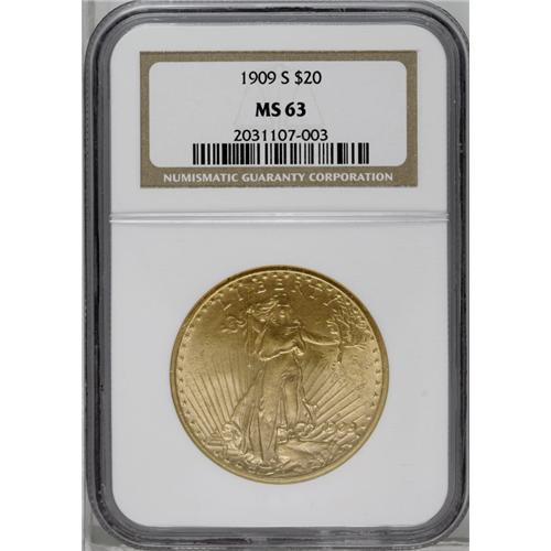 <B>1909-S<$20> MS63 NGC.</B></I> Breen-7375. The mintmark is widely repunched southeast. A seldom encountered and significant variety. This lustrous khaki-gold example is attractive to the naked eye despite distributed marks and some highpoint flatness on Liberty's chest and knee. <BR><BR><B>Important notice:</B> Heritage usually auctions material at the rate of 200-250 lots per hour. On some occasions eBay Live bid software or the Internet may not be able to keep up with the pace of the auction. We recommend placing a realistic absentee bid now as insurance to avoid disappointment. Occasionally the auctioneer may eliminate or reject an eBay Live bid, and the auctioneer may also reopen a lot after the close of the eBay live bidding (usually because we missed an audience bid), and may reject your bid even if it shows you as the winning bidder. By bidding via eBay Live, you agree that Heritage may award the lot to another bidder at its sole discretion under the circumstances described above or any other reasonable circumstances. Since eBay bids are not shown to us until we open the lot on the floor, we treat those bids just like floor bids. In most cases the floor responds before the eBay bid is presented to us, due to Internet lag time, so for consistency we have made it a policy that floor bids are always considered first over tie eBay live bids. Also please note that all Heritage lots purchased through eBay Live carry a 20% Buyer's Premium. Please make sure you read the Terms and Conditions before you bid. This lot is being auctioned in conjunction with a live floor auction by Heritage Galleries & Auctioneers. All final auction and invoice information will be supplied by Heritage Galleries & Auctioneers, and all other information should be considered preliminary. Lot:4584 <BR><BR><B>Winning Notification and Billing:</B> After the FINAL session in this auction is complete, Heritage will send e-mail and snail mail invoices. This process normally takes several days. All final auction and invoice information will be supplied by Heritage Galleries & Auctioneers, and all other information should be considered preliminary. <BR><BR>This auction will be conducted on a live auction floor and over the Internet through eBay Live. If you choose to place an absentee bid, please take a moment to <font color='#0000ff'><u><a href='http://pages.ebay.com/liveauctions/help/before/laabsentee.html'>learn how eBay Live absentee bidding works</a></u></font><font color='#000000'>