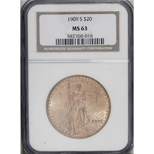1909-S $20 MS63 NGC. Select and solidly struck with su