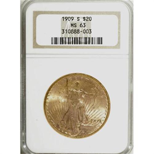 <B>1909-S $20 MS63 NGC.</B></I> NGC Census: (1510/1511). PCGS Population (1538/1663). Mintage: 2,774,925. Numismedia Wsl. Price for NGC/PCGS coin in MS63: $940. (#9153)<BR><BR><B>Coin Engraver:</B> Augustus Saint-Gaudens<BR><BR><b>Shipping:</b> Coins & Currency (<a target="_blank" href="http://www.heritageauctions.com/common/shipping.php">view shipping information</a>)
