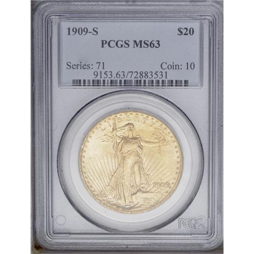 1909-S $20 MS63 PCGS. Both sides of this lustrous hone 1909-S[$20] MS63 PCGS.