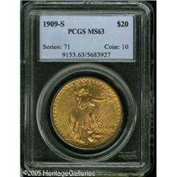 <B>1909-S $20 MS63 PCGS.</B></I> Shimmering luster resides over the surfaces and the devices are intricately defined. Lot:9491