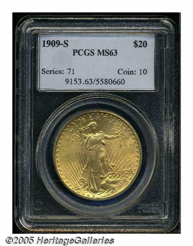 <B>1909-S<$20> MS63 PCGS.</B></I> The mintmark is slightly repunched and the surfaces show ample luster.