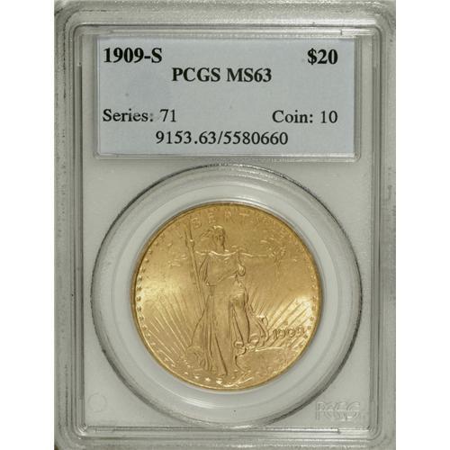 1909-S $20 MS63 PCGS. The mintmark is slightly repunch