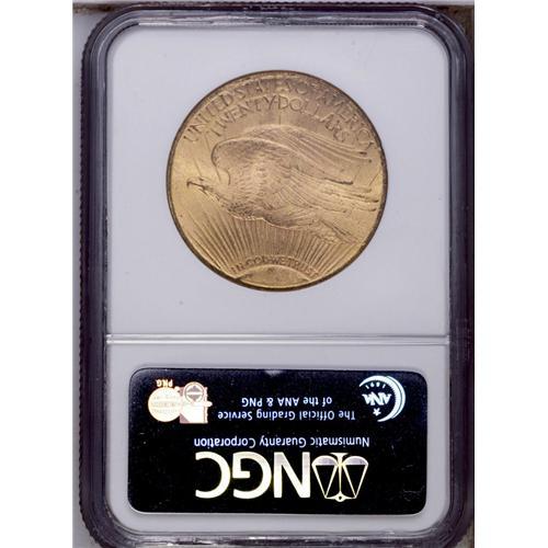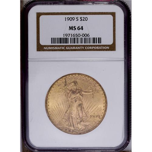 <B>1909-S<$20> MS64 NGC.</B></I> A satiny and original near-Gem with clean fields and a couple of moderate marks on Liberty's left (facing) leg. The mintmark is nicely repunched southeast.