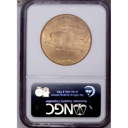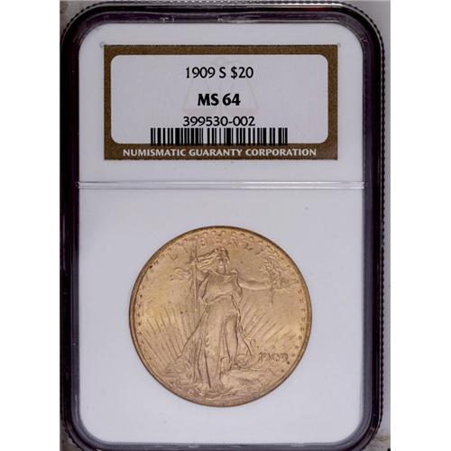 <B>1909-S<$20> MS64 NGC.</B></I> A satiny pale copper-gold example of this early Saint-Gaudens issue. The strike is good except for the BER in LIBERTY and the IN in IN GOD WE TRUST.