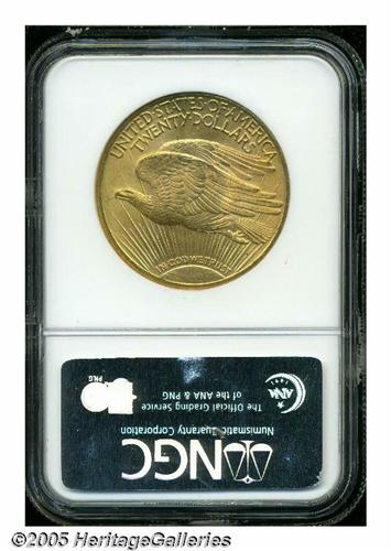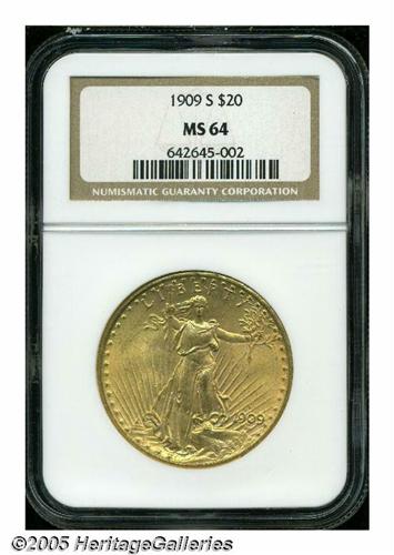 <B>1909-S<$20> MS64 NGC.</B></I> An attractive piece with pleasing, satiny mint luster and a bold strike. Just a few lightly scattered marks, and one larger blemish on Liberty's belly, keep this coin from the Gem category.