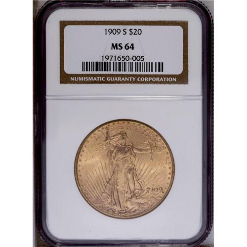 <B>1909-S<$20> MS64 NGC.</B></I> Lustrous with matte-like surface textures and lovely reddish-gold toning. A couple of minor abrasions are noticeable on the lower reverse.