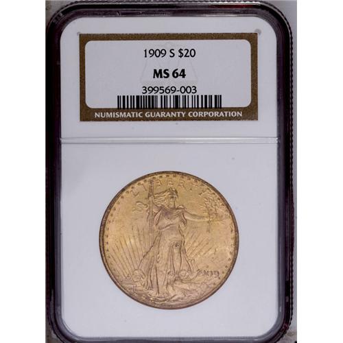 "1909-S $20 MS64 NGC. Nicely struck, wit"