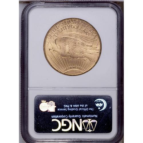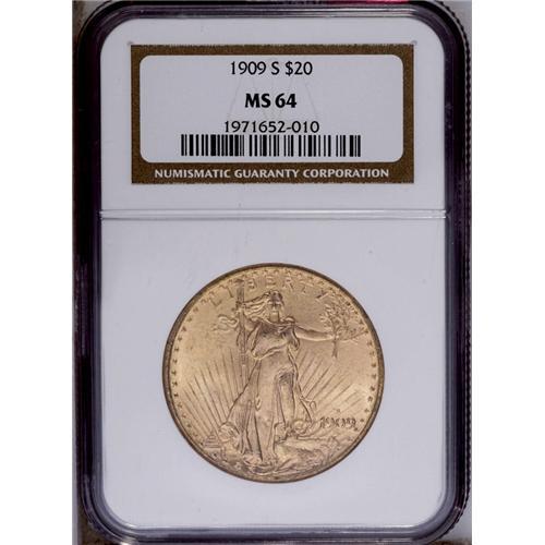 <B>1909-S<$20> MS64 NGC.</B></I> This attractive pale peach-gold near-Gem is sharply struck aside from the center of the sun. The obverse is particularly smooth. The mintmark serifs are lightly repunched.